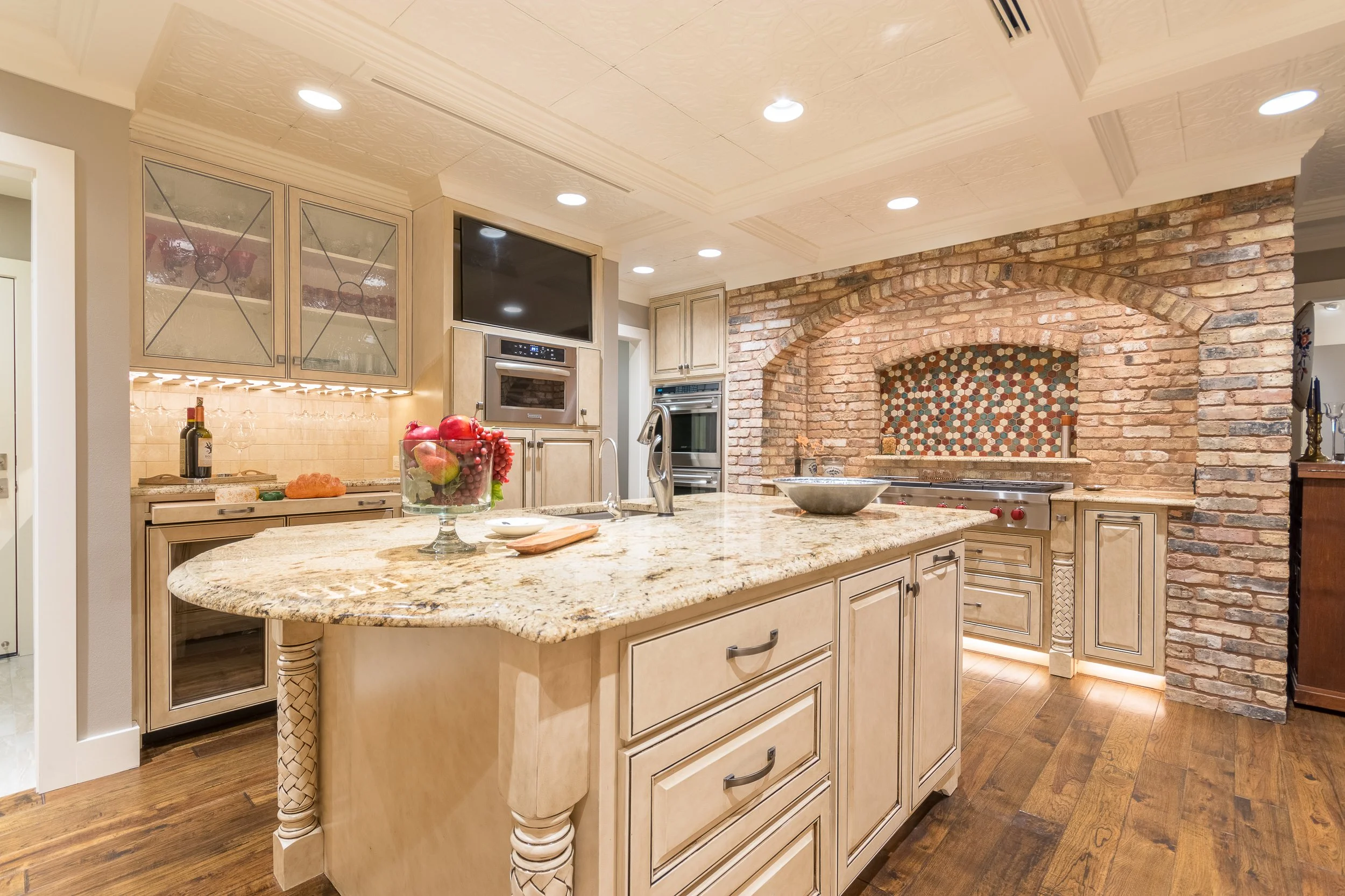 Overall, this is a spacious, well-planned kitchen with a Sub-Zero®/Wolf® appliance package, custom pullouts, exotic granite, stone and handmade glazed tiles, custom leaded glass doors, a specialty glazed cabinetry finish and a coffered tin ceiling. As for the end result, not only does the kitchen function better now, but the new layout has affected the flow of the rest of the house as well. Even though there are still distinct spaces, there is a logical path for entertaining and everyday living. There are now zones: work zones, entertaining zones, and private zones. The layout is intuitive; bright, cheerful and inviting.